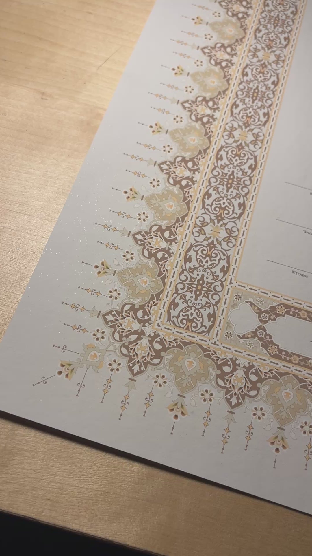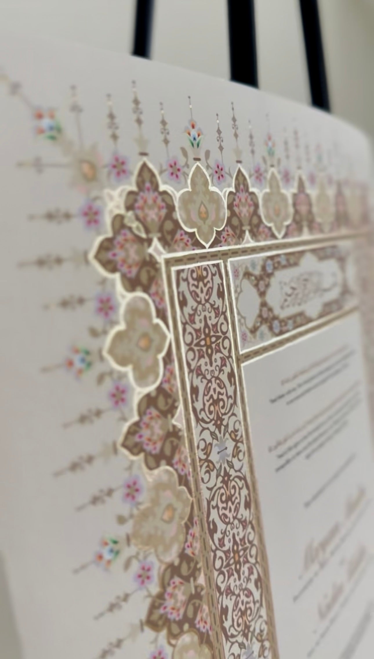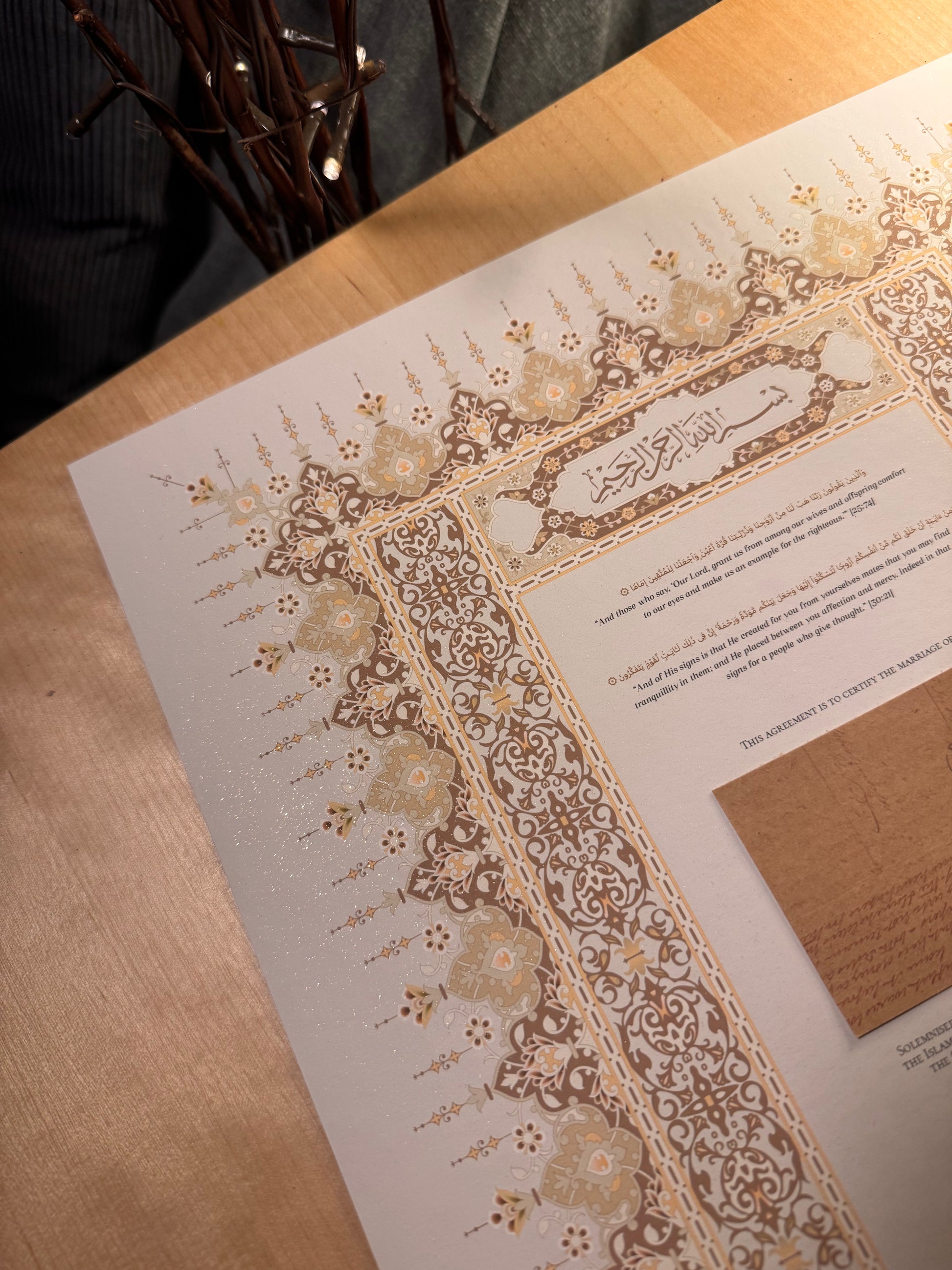 04: Zakhraf takes its name from the Arabic term for embellishment and decorative detailing. This design frames the contract with motifs reminiscent of illuminated manuscripts and textile borders. The palette is kept muted to complement the intricacy and allow the composition to breathe.