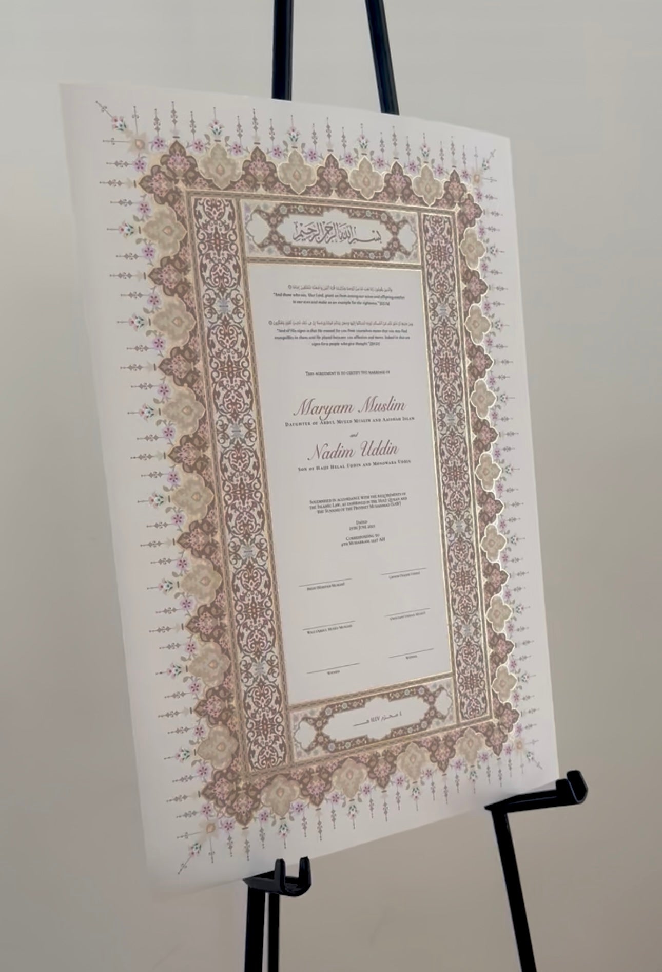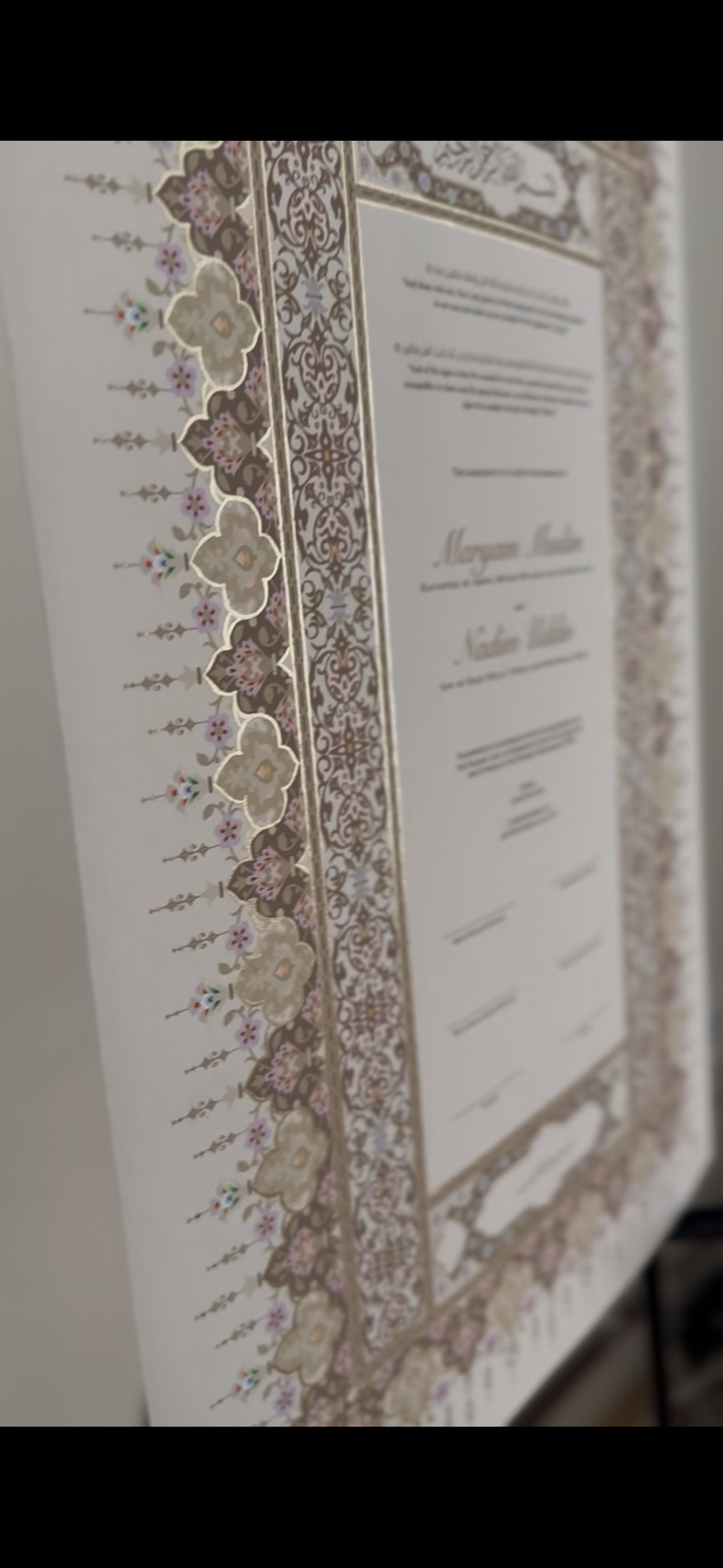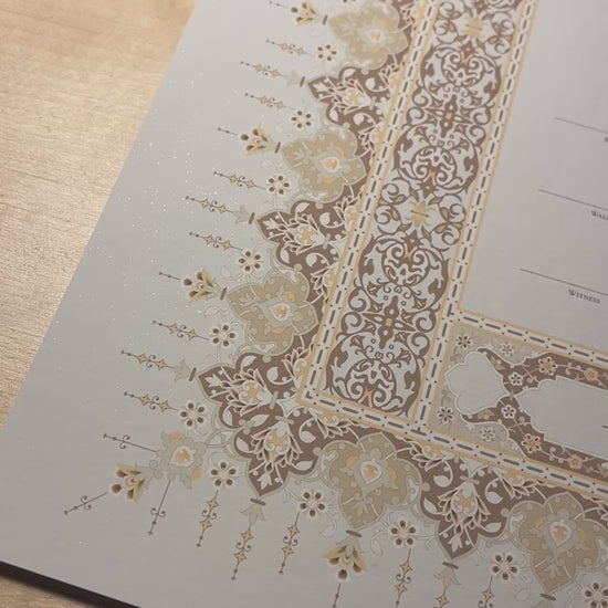 04: Zakhraf takes its name from the Arabic term for embellishment and decorative detailing. This design frames the contract with motifs reminiscent of illuminated manuscripts and textile borders. The palette is kept muted to complement the intricacy and allow the composition to breathe.